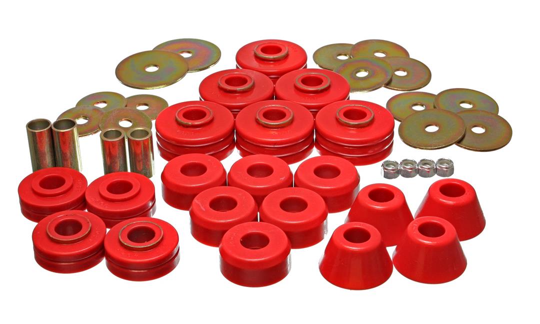 Summary: The Energy Suspension Body Mount Bushings are designed to replace distorted and worn-out original rubber mounts to maintain proper car body and truck cab-to-bed alignment. Featuring a Red performance aesthetic, these bushings are constructed from proprietary Hyper-Flexâ„¢ Polyurethane, which is rugged enough for demanding road or track use while remaining soft enough for a smooth ride. This upgrade ensures your vehicle lasts 5 to 10 times longer than conventional rubber components by resisting the cracking and crushing that often plague OEM mounts. By choosing Energy Suspension, you eliminate the harshness of aluminum mounts while gaining the structural integrity needed for your K5 Blazer.