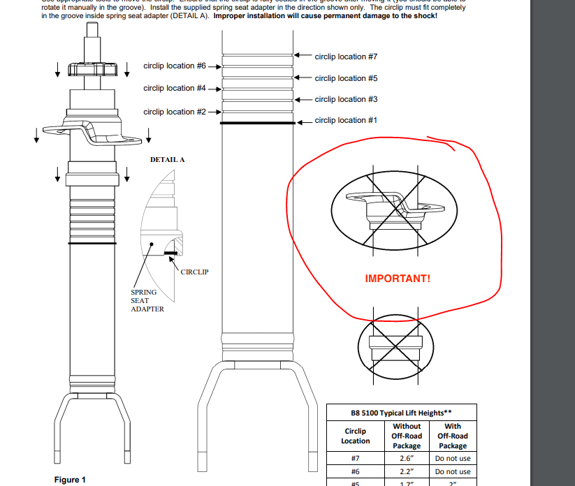 Fitment notes: For vehicles Without Air Suspension. Vehicles with Offroad package do not use top 2 circlip locations. Highest lift for Offroad package is 2″