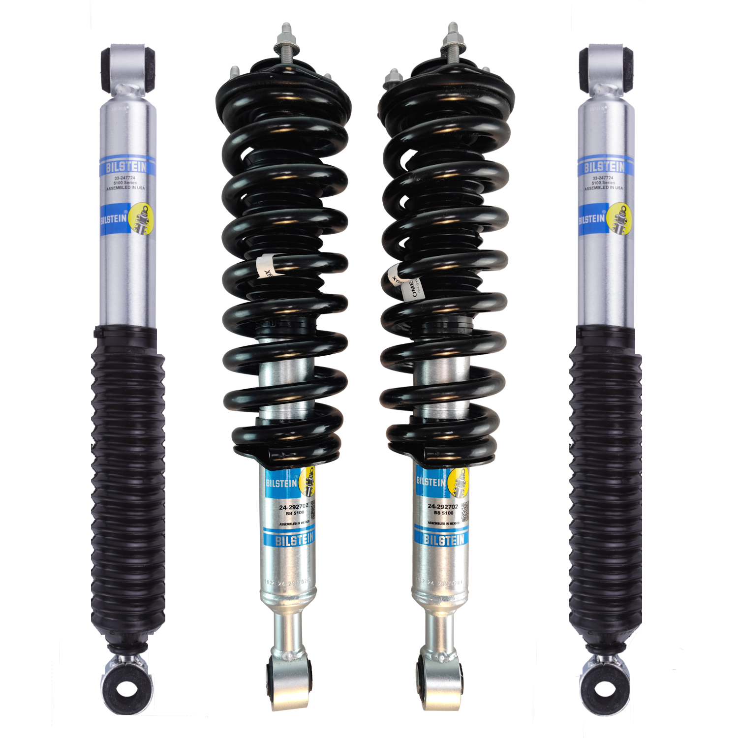 Bilstein 5100 Shocks Assembled with Moog Springs. These are stock height replacement coilovers with option to adjust the lift.