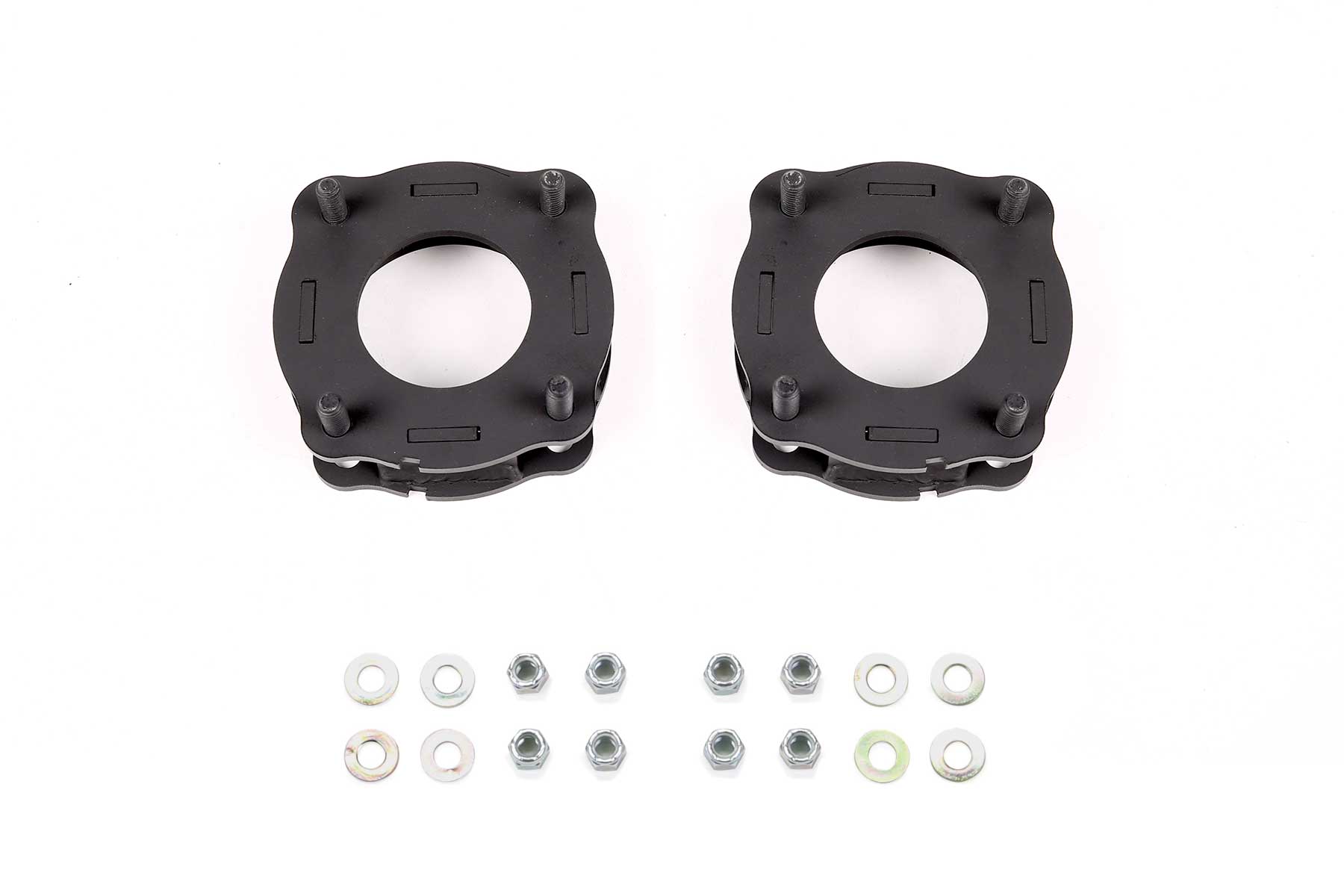 Fabtech’s Toyota Tundra Leveling Kit features welded steel front spacers that work in conjunction with the factory Coilover shock assemblies. They are designed to bolt in without the disassembly of the factory coilover shocks for a fast installation.
